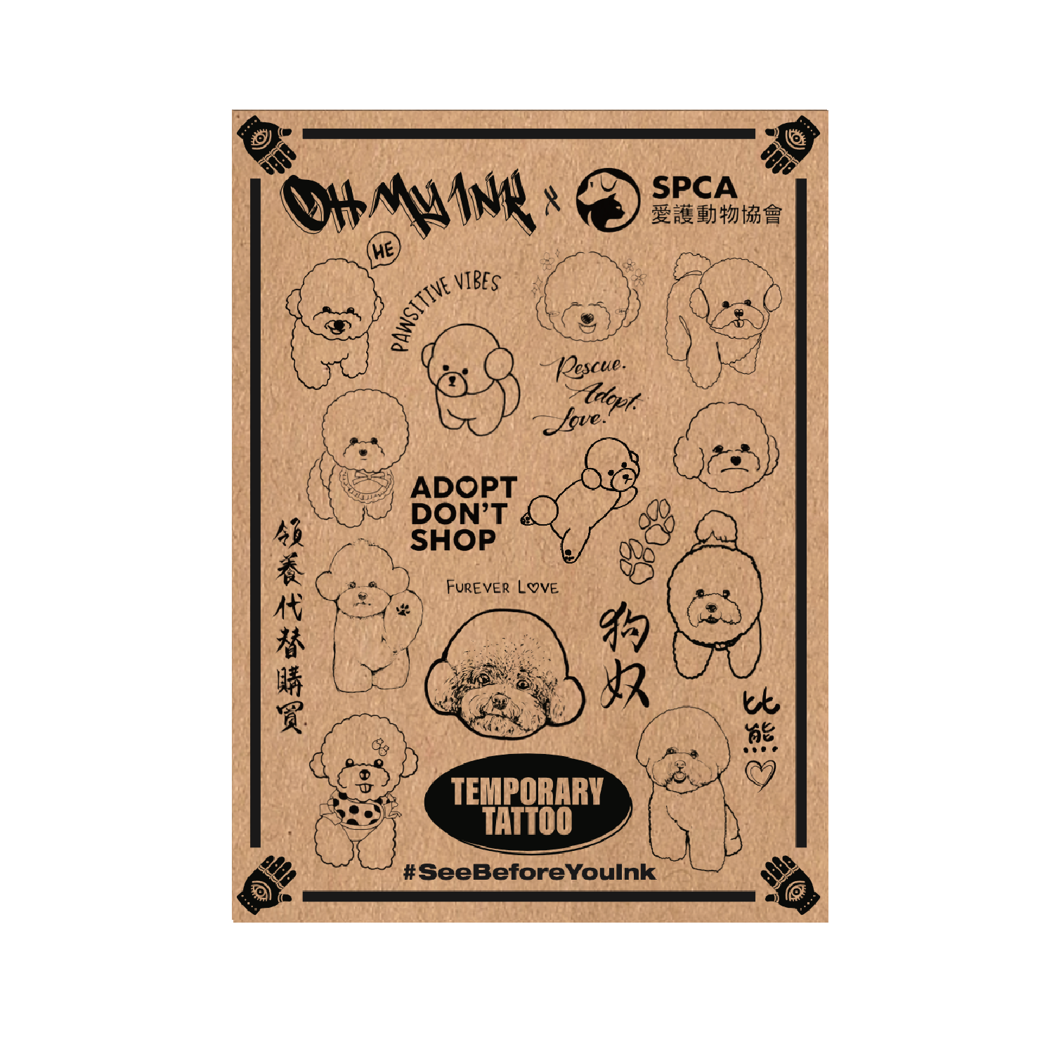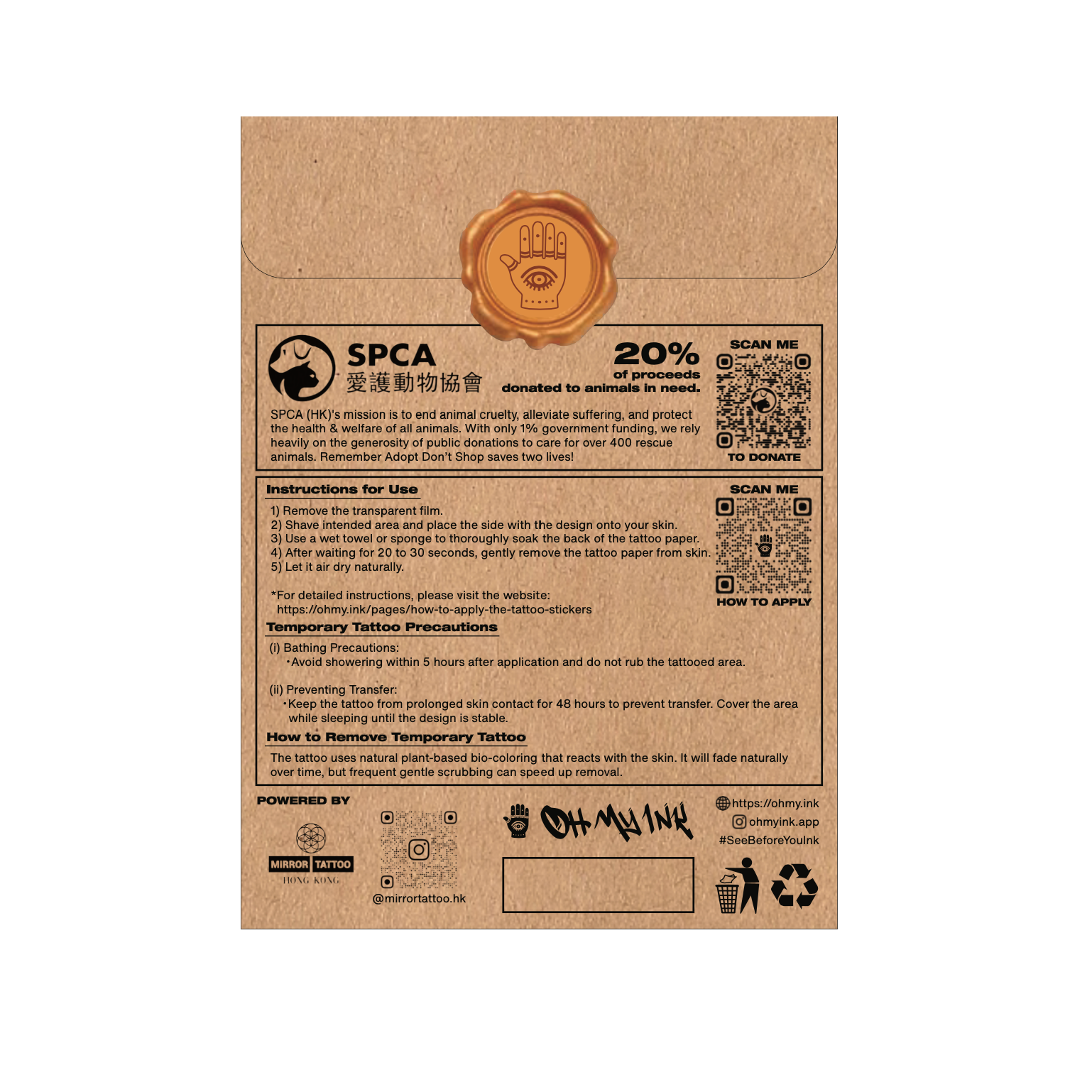 1) 此盲盒套裝包含從全部 15 個紋身中選擇的 5 個臨時紋身和 5 個 SPCA 主題紋身。