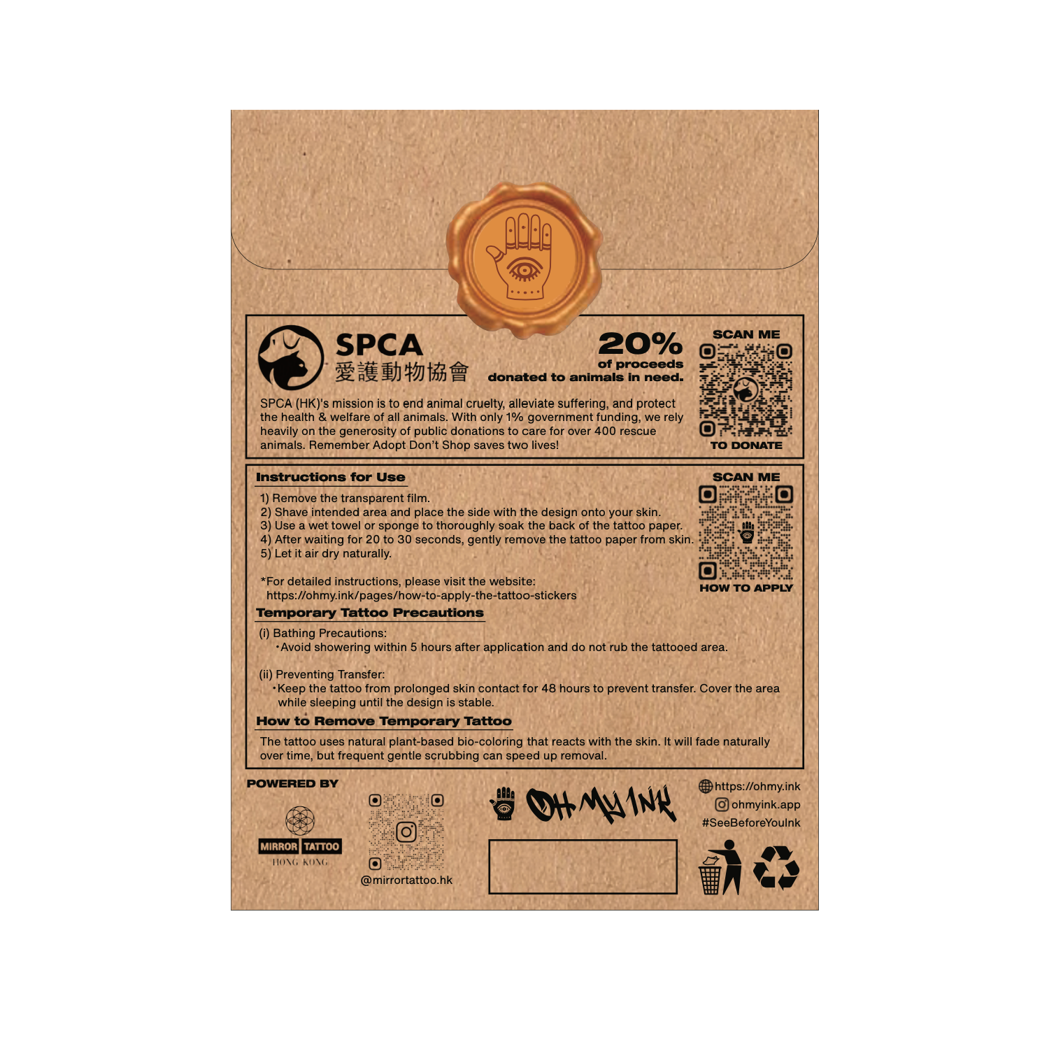 1) 此盲盒套裝包含從全部 15 個紋身中選擇的 5 個臨時紋身和 5 個 SPCA 主題紋身。