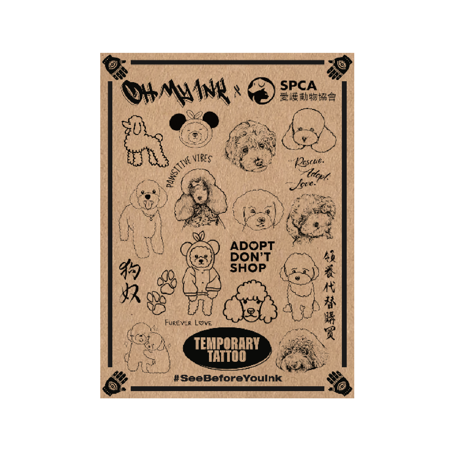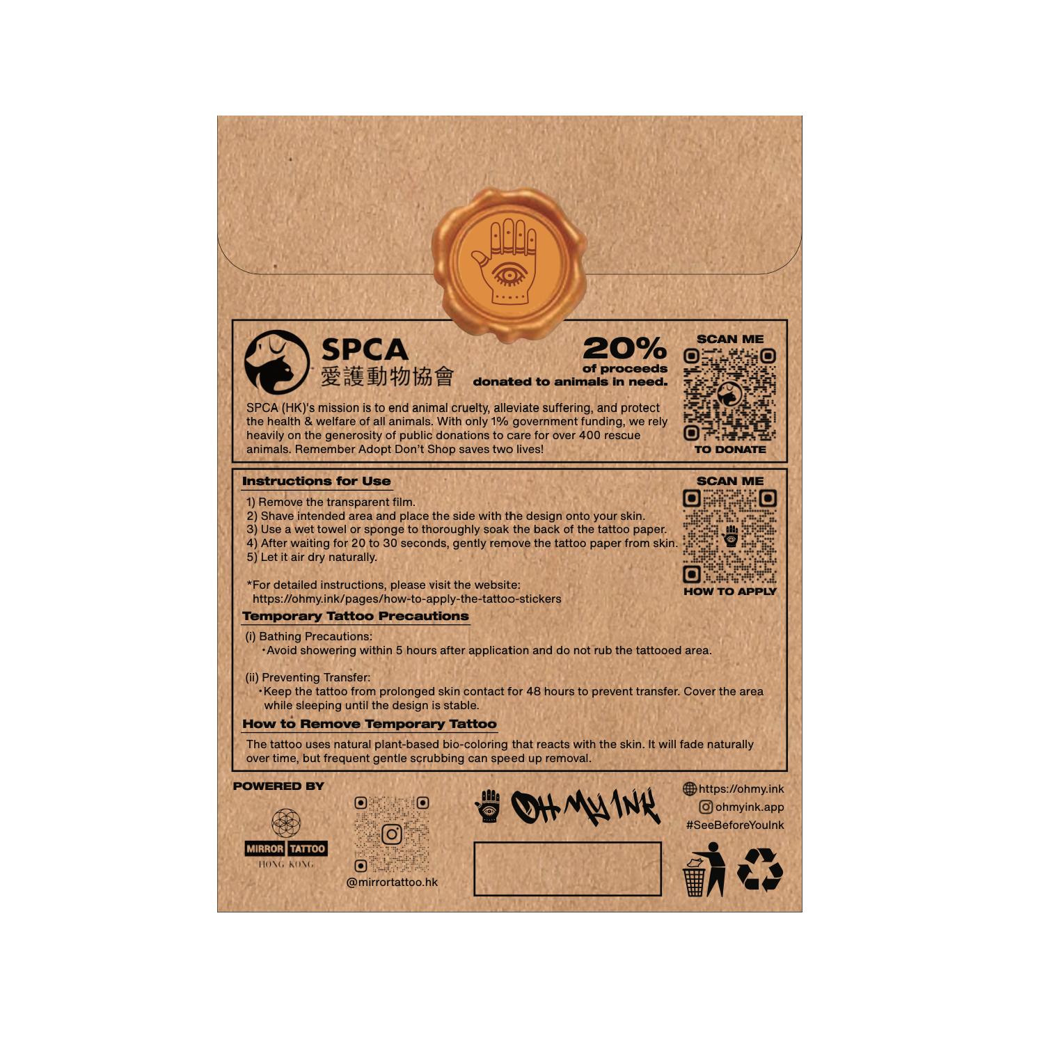 1) 此盲盒套裝包含從全部 15 個紋身中選擇的 5 個臨時紋身和 5 個 SPCA 主題紋身。